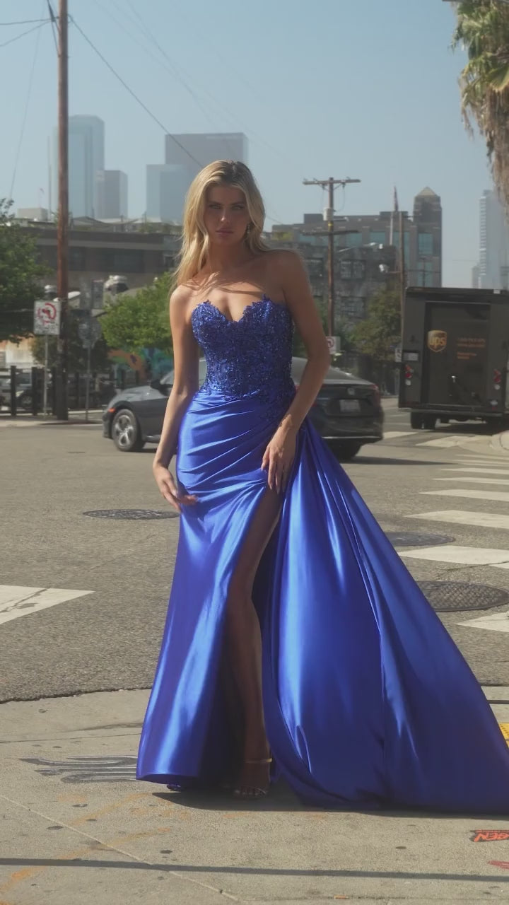 This fitted gown features a strapless sweetheart neckline and a beaded bodice adorned with intricate satin and lace appliqué. The design is enhanced by a leg slit and a stylish sash, creating a flattering silhouette that exudes elegance. Perfect for prom, formal events, or black-tie occasions, this dress offers both sophistication and support.