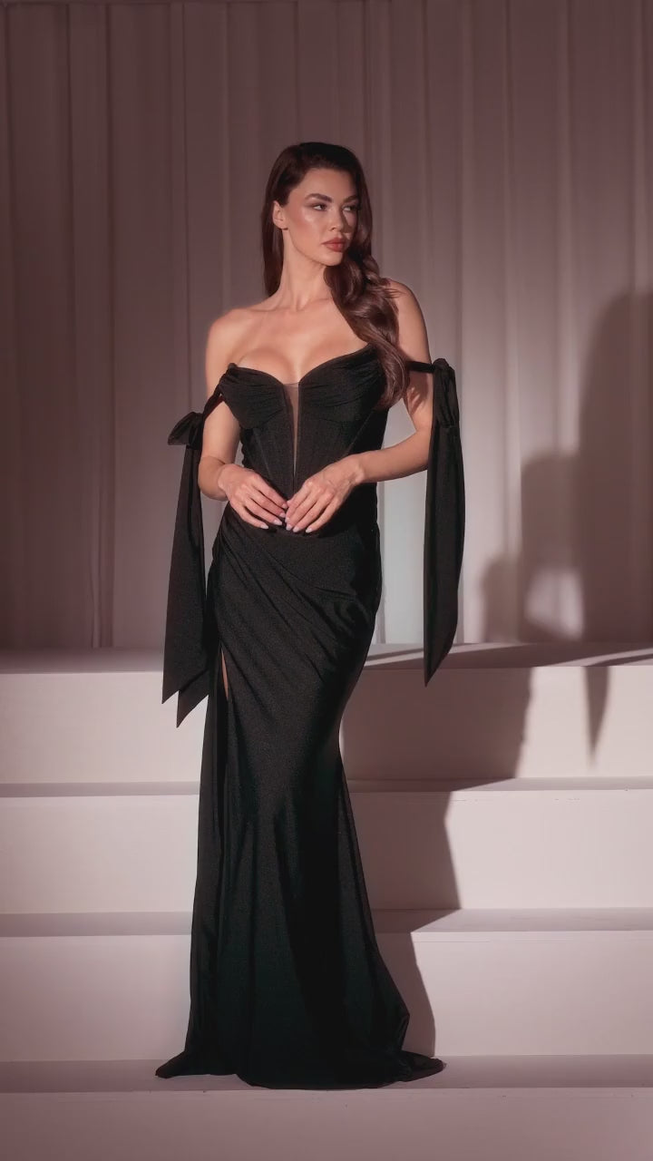 - Design: Plunging neckline, off the shoulder ties, pleated waistline & leg slit
