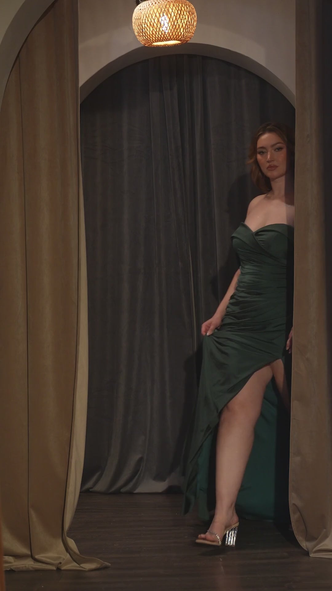• Design: Sweetheart off-the-shoulder neckline, pleated waistline, leg slit