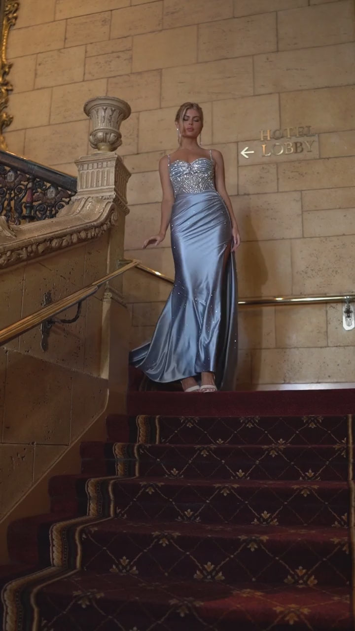 • Design: Sweetheart neckline, thin straps, beaded bodice, side sash & leg slit