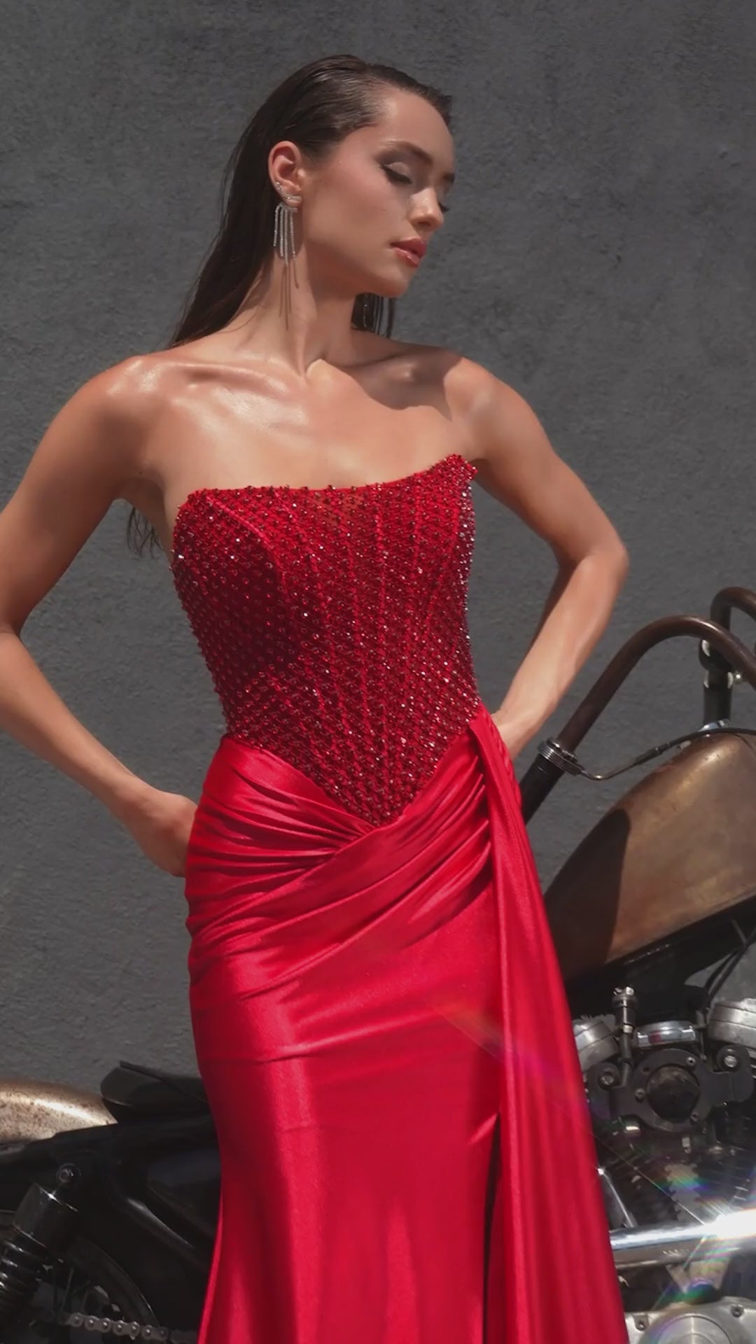 Turn every head in this stunning fitted gown created to command attention the moment you walk in. The strapless neckline frames the shoulders beautifully, while the opulently embellished bodice sparkles with dazzling stones that give the entire look a radiant glow.