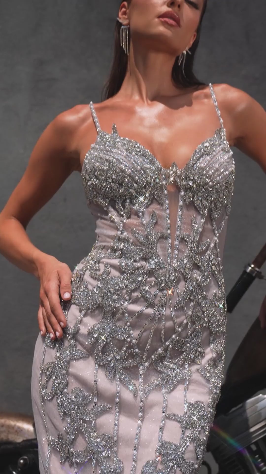 • Fabric & Material: Crystal and sequin beading on sheer tulle overlay